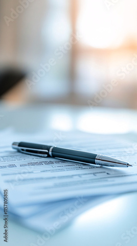 A minimalistic close-up of a sleek pen resting on a stack of paperwork with soft blurred backgrounds creating a calming atmosphere
