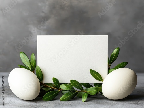 A minimalistic composition of white eggs and fresh leaves with a blank card for customization on a neutral background.