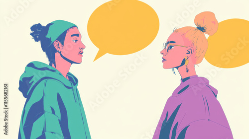 A minimalistic flat design of a friendly exchange between two characters, one with a green hoodie and the other in a purple cardigan, expressing lively conversation with text bubbles in soft pastel sh