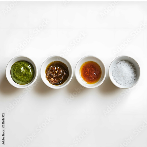 A minimalistic layout featuring four small white ceramic bowls arranged in a straight line each containing a different type of condiment The contents have been adjusted