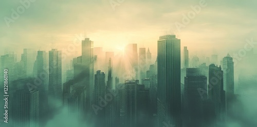 A Misty Cityscape at Sunrise Over Skyscrapers