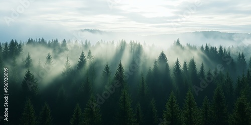 A misty forest landscape where sunlight breaks through the fog, creating an ethereal and picturesque scene.