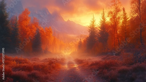A misty forest path leading towards mountains at sunrise with golden leaves and a dramatic sky.