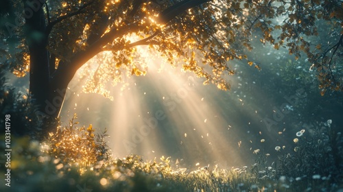 A misty forest with sunlight filtering through the trees, creating an ethereal and magical atmosphere. The photo captures the play of light on foliage and branches, creating a dreamlike scene. warmth.