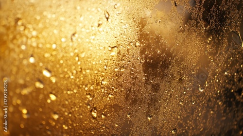 A misty glass surface covered in water droplets, illuminated by warm golden sunlight, creating a dreamy and abstract effect.