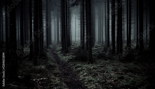 A misty pathway leads through a dark forest of tall trees
