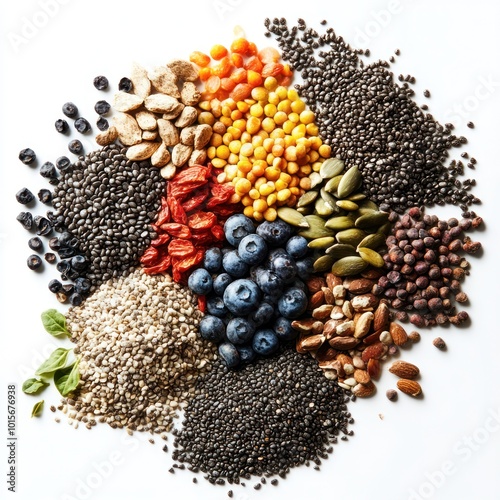 A mix of nutrient-packed superfoods, isolated on white, focus on textures and colors