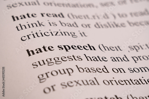 A mock up of a dictionary page with the word Hate Speech with selective focussing
