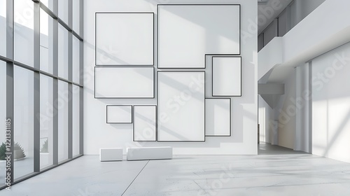 a mockup art gallery with blank empty frames and blank white painting canvases