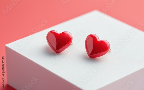 A mockup of a pair of heart-shaped earrings displayed on a soft white-to-red matte surface for valentines day and 8 march