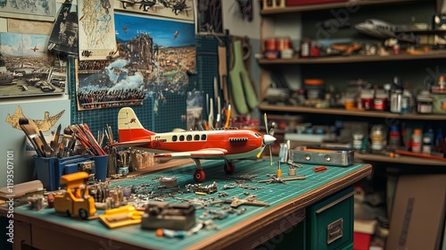 A model airplane hobby desk with tools, paints, and tiny parts arranged neatly