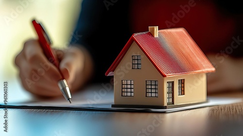 A model house placed on a table with a person signing a document, symbolizing real estate transactions and home ownership.