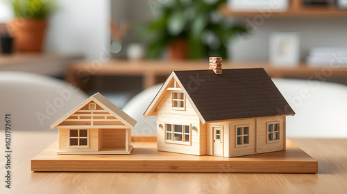 a model of a small wooden house on a table, real estate downsizing and homeownership concept background with copy space