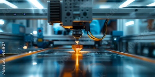 A modern 3D printer is seen in action, with precision machinery and glowing lights, constructing a new object layer by layer, showcasing advanced technology.