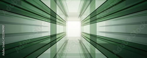 A modern, abstract image featuring green glass panels converging toward a bright light, creating a sense of depth and perspective.