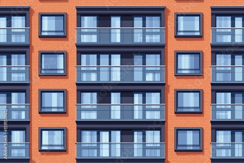 A modern apartment building facade featuring vibrant orange brick and contrasting blue windows with balconies. Ideal for urban lifestyle and architecture themes.