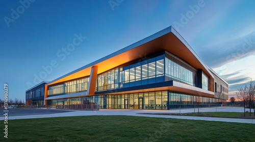 A modern, architecturally striking building featuring a sleek glass wall that reflects sunlight, surrounded by a lush grassy area, perfect for outdoor gatherings and relaxation.