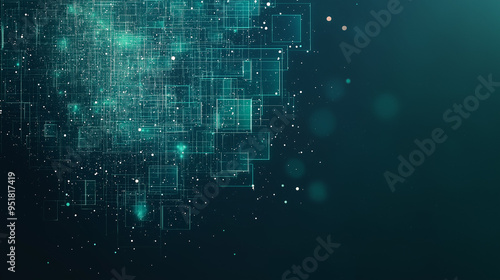 A modern background, featuring teal gradients with futuristic boxes, representing innovation in sports technology, The design includes subtle elements of Blockchain or cyberpunk to convey themes like