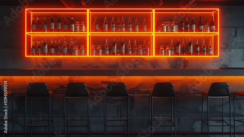 A modern bar interior featuring illuminated shelves filled with bottles, creating a vibrant nightlife atmosphere.