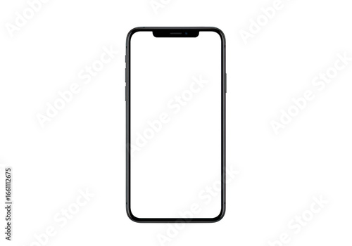 A modern black smartphone with a blank white screen, isolated on a transparent background
