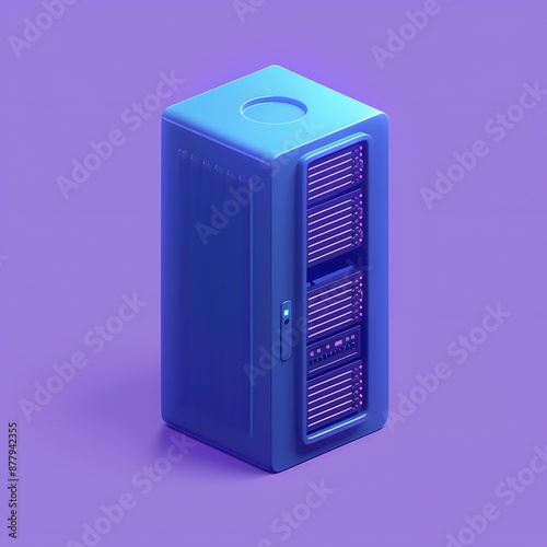 A modern blue server rack against a purple background, showcasing data storage technology in a minimalist style.