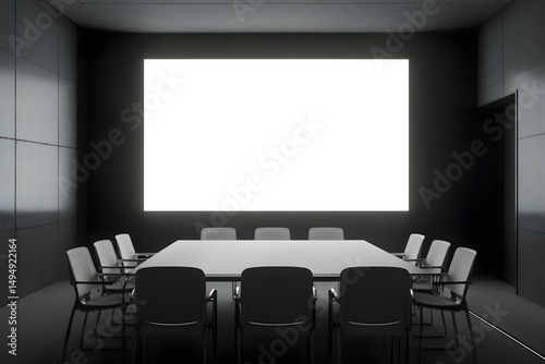 A modern boardroom with empty screen and empty chairs. A sleek and minimalist setting ready for presentation or meeting. The room has a spacious and uncluttered ambiance