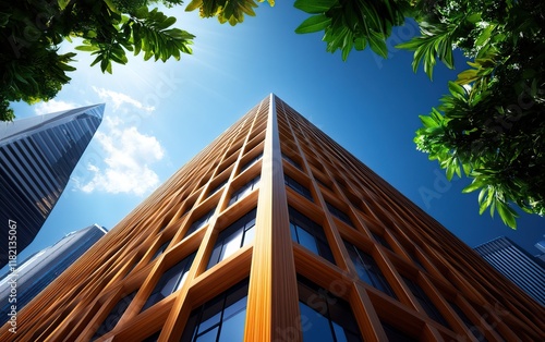 A modern building with a wooden facade is framed by lush greenery under a clear blue sky, showcasing contemporary architecture.