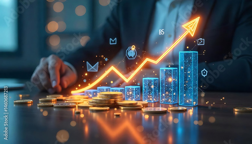 “A modern business-themed digital artwork showing a growing business graph with glowing digital marketing icons around it. Gold and silver coins scattered on a desk, symbolizing cryptocurrency or fina