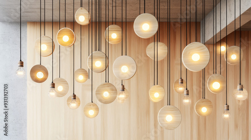 a modern circle wooden ceiling lamp within a loft-style interior, emphasizing its design, functionality, and aesthetic contributions to contemporary decor