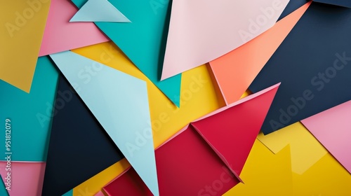 A modern, colorful abstract art composition of overlapping geometric shapes in various bright colors and patterns, displaying a playful and dynamic visual appeal.