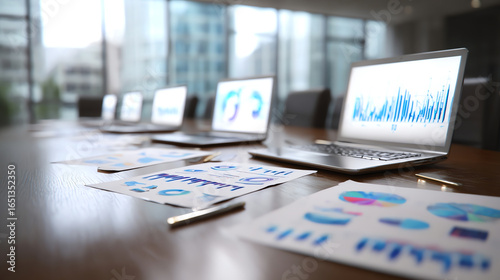 A modern conference room featuring laptops and reports showcasing business analytics and data visualization.