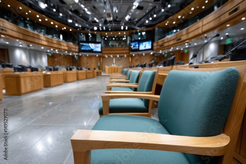 A modern conference room showcasing elegant wooden chairs and a spacious layout, ideal for meetings and professional discussions in a corporate setting.