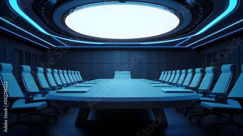 A modern conference room with a sleek design, featuring a large table, high-backed chairs, and illuminated ceiling, creating a professional atmosphere.