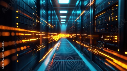 A modern data center with illuminated cables and rapid data streams flowing between powerful servers