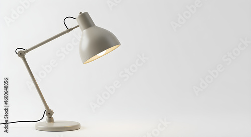 A modern desk lamp illuminates a white background, casting a soft glow.