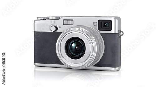 A modern digital camera, ready to capture a moment in time. The camera is sleek and stylish, with a focus on the lens