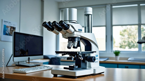 A modern digital trinocular microscope stands on a laboratory table, surrounded by glassware, ready for scientific research