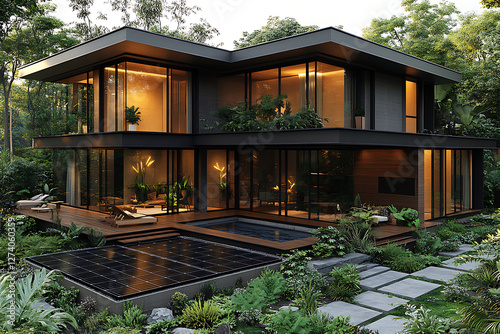 A modern eco-friendly house with solar panels on the roof, illuminated by warm sunlight. The image represents renewable energy, sustainable living, and energy efficiency. Perfect for themes related to