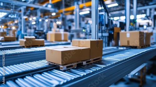 A modern factory production line featuring automated conveyor belts carrying cardboard boxes, showcasing efficient manufacturing processes and modern industrial technology.