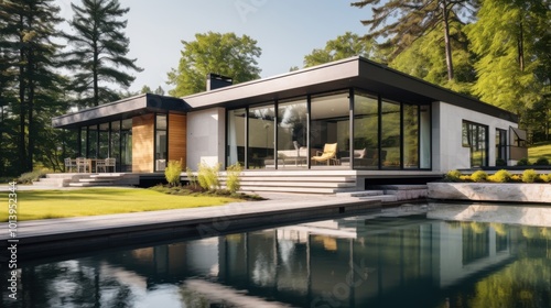 A modern glass-fronted house reflects in a tranquil pool, surrounded by lush greenery, exuding sophistication and harmony with nature.