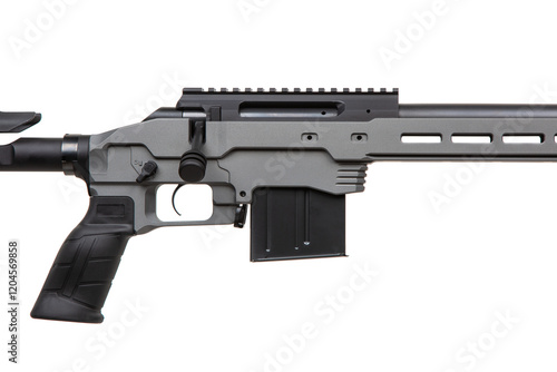A modern, gray precision rifle with a long barrel, adjustable stock, and tactical design, suitable for long-range shooting and hunting. Isolate on white background.
