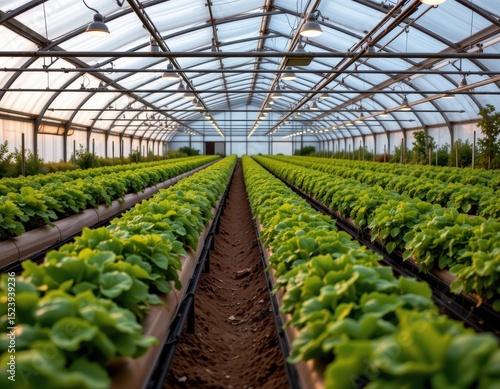 a modern greenhouse farm with rows of vegetables growing under translucent glass panels, automated irrigation systems and led grow lights glowing softly.