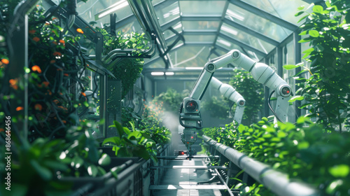A modern greenhouse with automated climate control and robotic arms tending to the plants