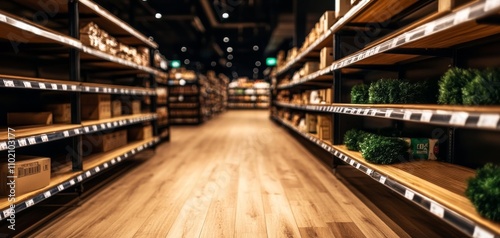 A modern grocery store aisle featuring wooden floors and shelves stocked with boxes and greenery, creating a welcoming shopping environment.