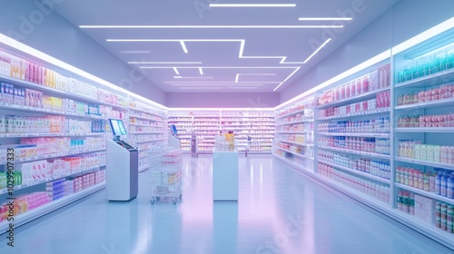 A modern grocery store with bright white walls and pink and blue lighting. The shelves are stocked with a variety of products. There are self-checkout kiosks in the middle of the store.