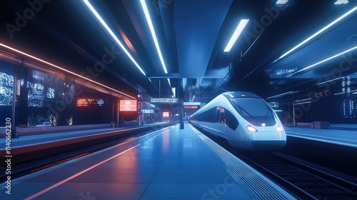 A modern high-speed train station with sleek platforms, digital displays, and glowing LED lights illuminating the area