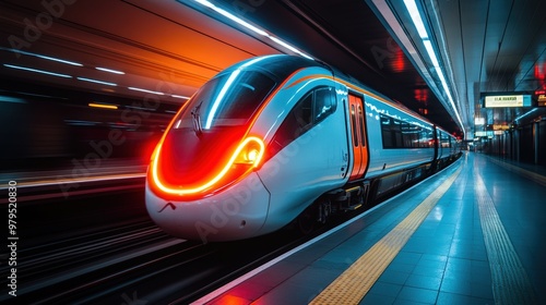 A modern high-speed train with sleek aerodynamic design, featuring vibrant orange accents, speeds through a futuristic train station platform illuminated with neon lights