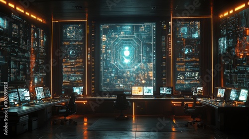 A modern, high-tech workspace filled with digital devices, large digital screens displaying AI-generated data