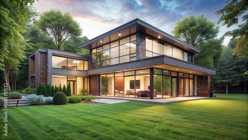 A modern house with large windows surrounded by a lush green lawn and tall trees, showcasing a serene and natural ambiance , architecture, serenity