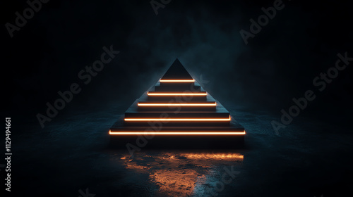 A modern illuminated pyramid with glowing edges, set against a mysterious dark backdrop.